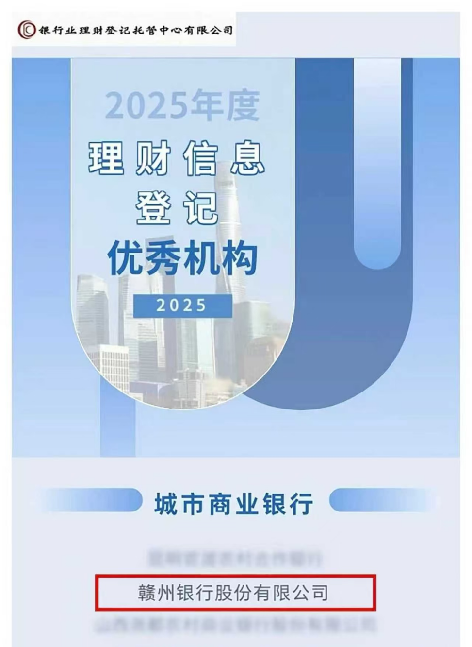 近日,银行业理财登记托管中心有限公司正式公布2025年度理财信息登记工作评定结果。在众多参评机构中,赣州银行脱颖而出,荣膺“2025年度理财信息登记优秀机构”称号。