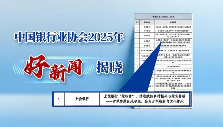 3月17日,中国银行业协会发布2025年银行业“好新闻”评选结果,上饶银行报送新闻作品《上饶银行“绿标贷”,精准赋能乡村振兴与绿色转型——首笔贷款落地婺源,助力古宅焕新与文化传承》从全国众多参评作品中脱颖而出,获评金融机构组“金融成就”好新闻。